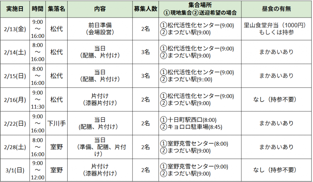 募集日 2/13(金)、2/14(土)、2/15(日)、2/16(月)、2/22(日)、2/28(土)、3/1(日)